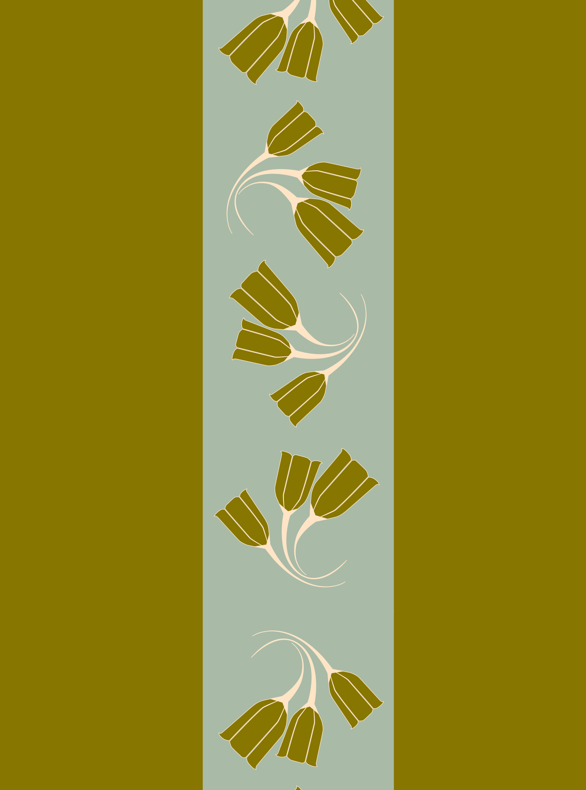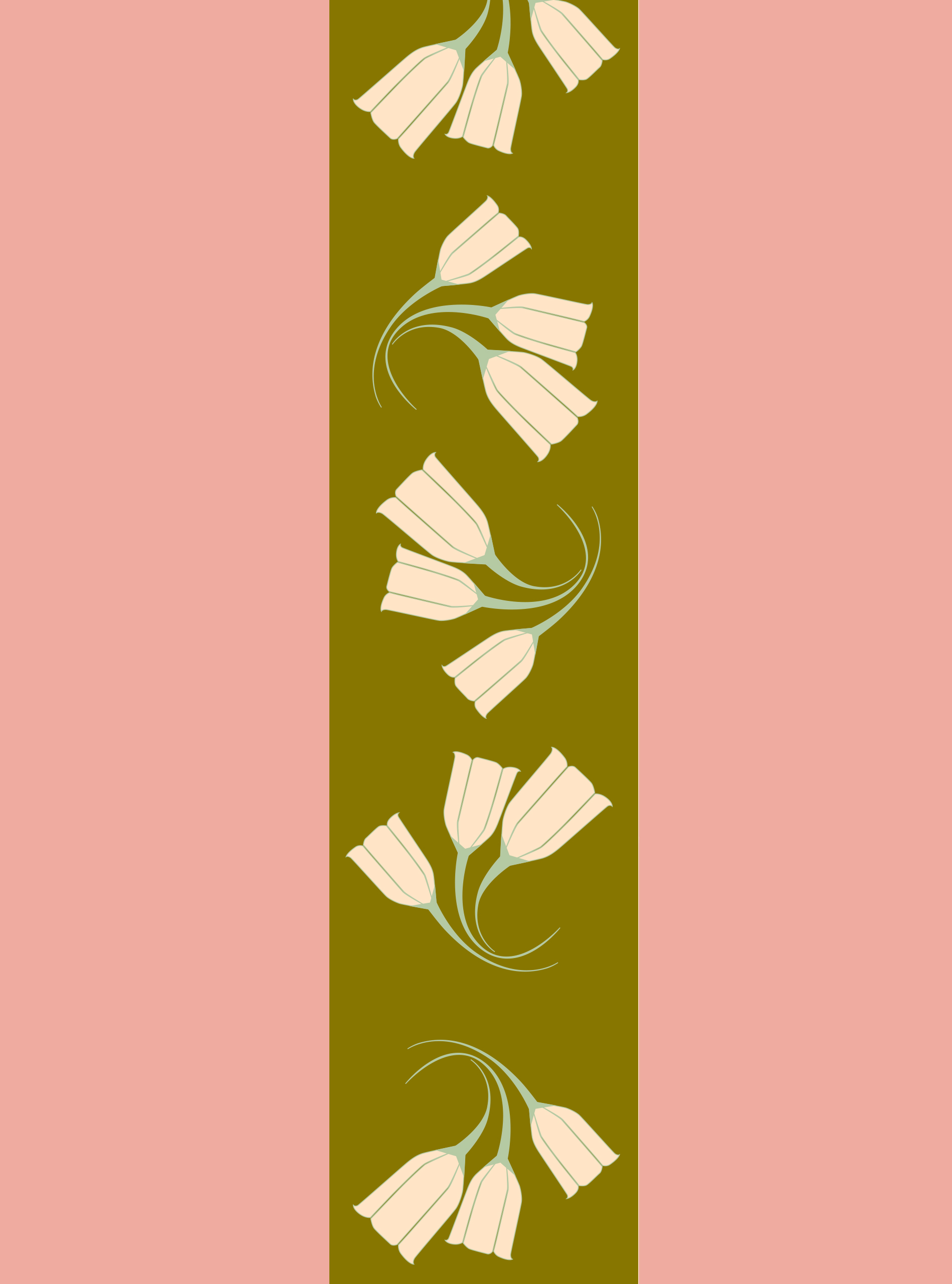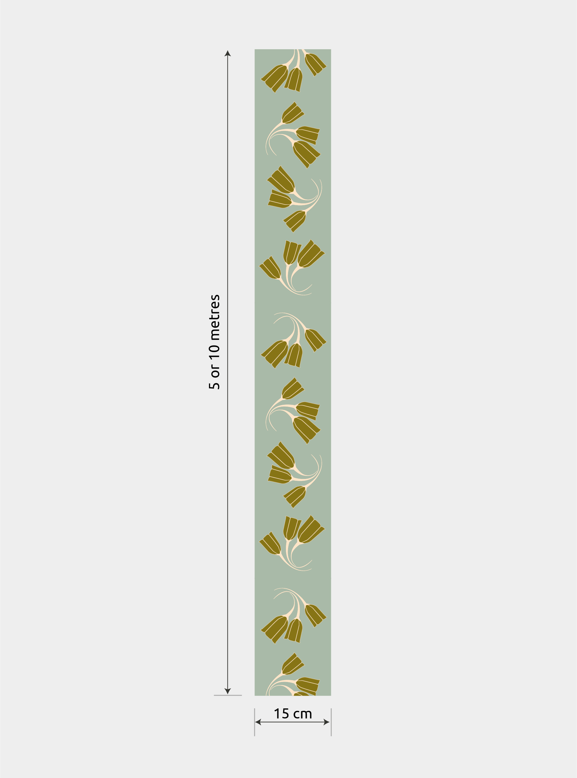 This wallpaper borders features a delicate, minimalist floral design with soft cream and olive-green blossoms flowing gracefully across warm backgrounds in shades of peach, ochre, and sage.