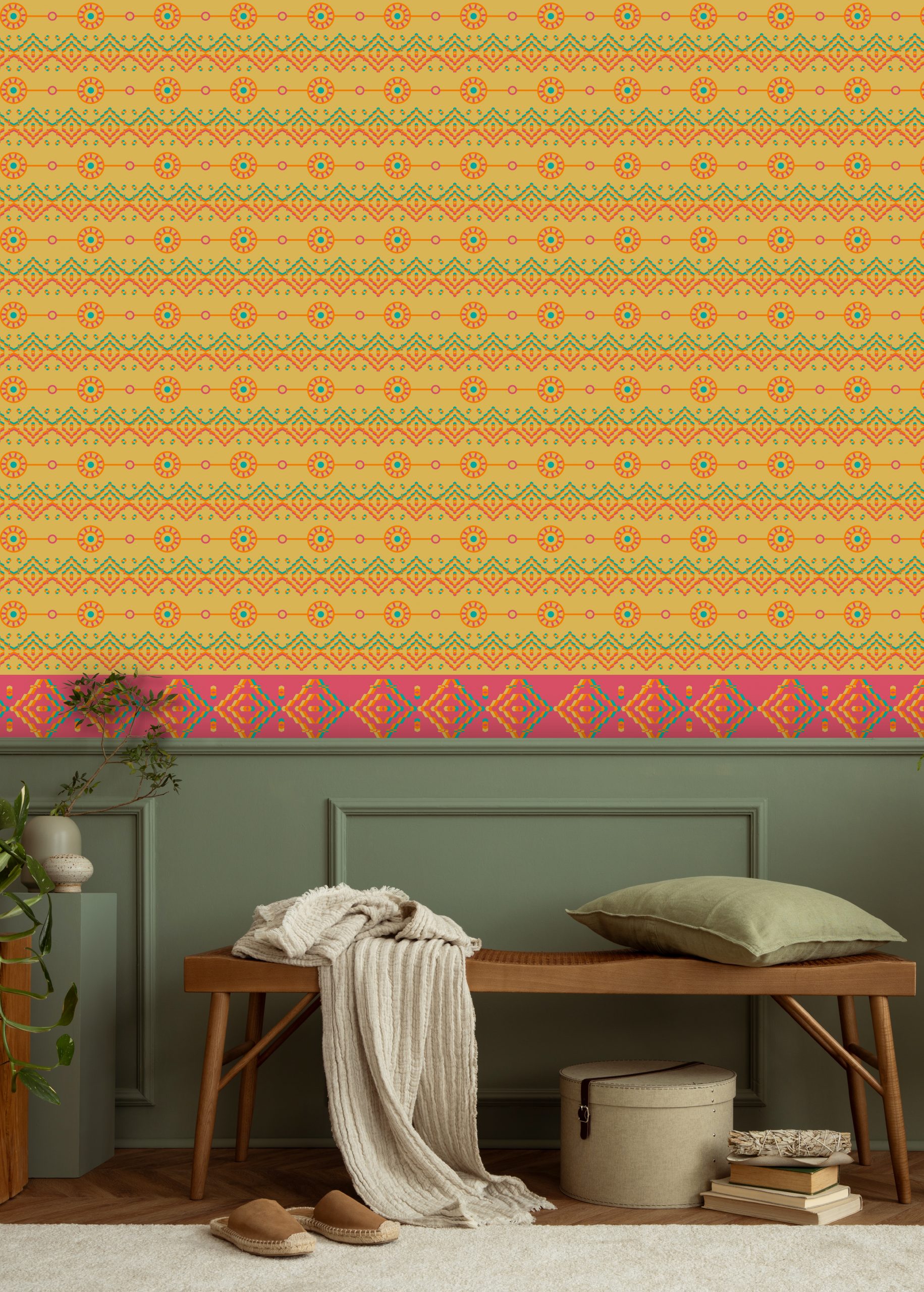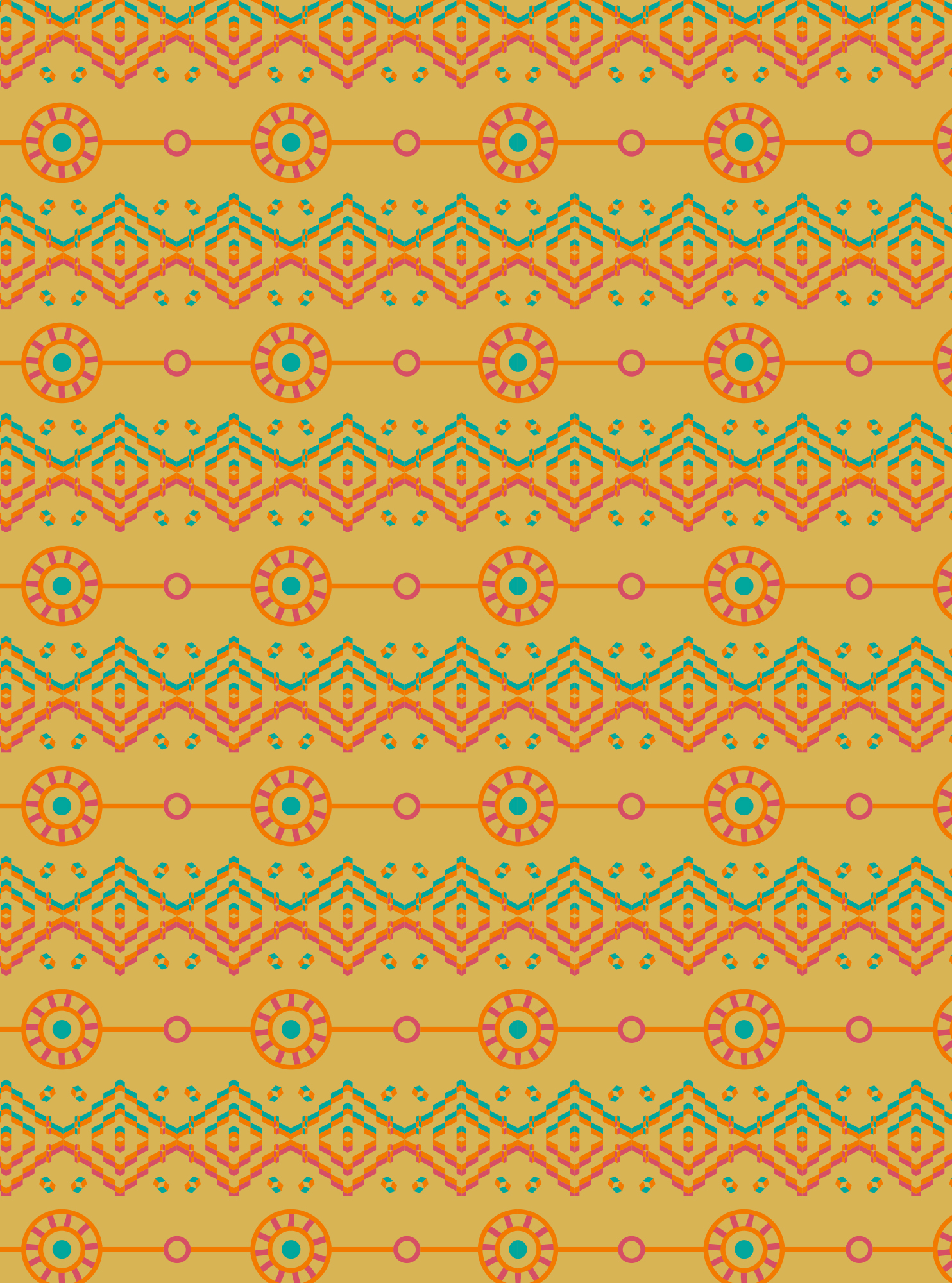 The repeating diamonds and radiant circles echo the intricate artistry of ancient textiles and sacred symbols, brought to life with a modern twist in warm golds, energetic corals, and refreshing turquoise. It’s a pattern that tells a story of connection, rhythm, and cultural pride – perfect for sparking creativity and adding a touch of heritage-inspired charm to any space.