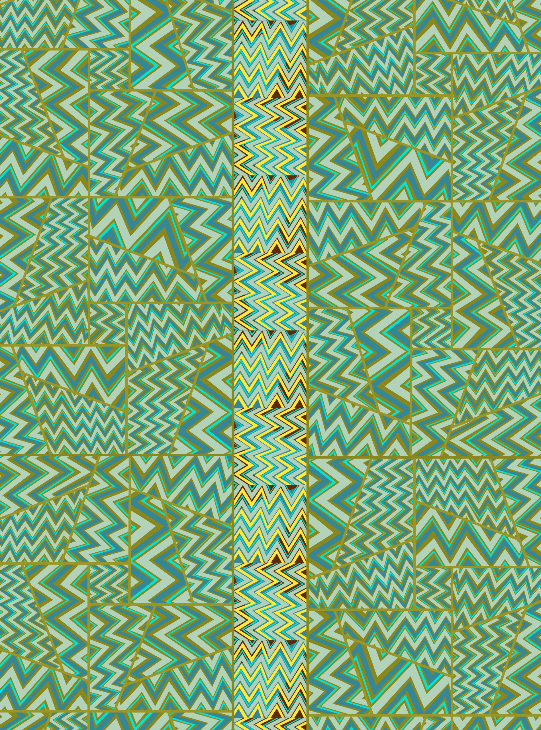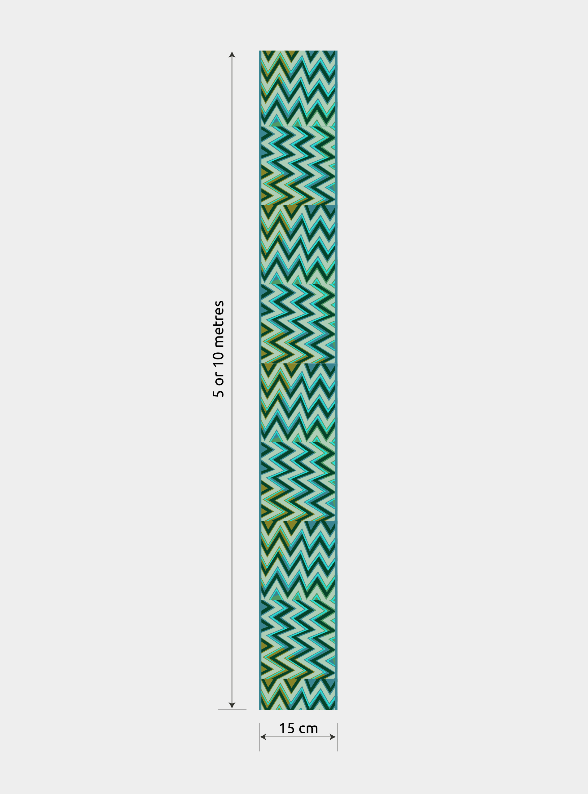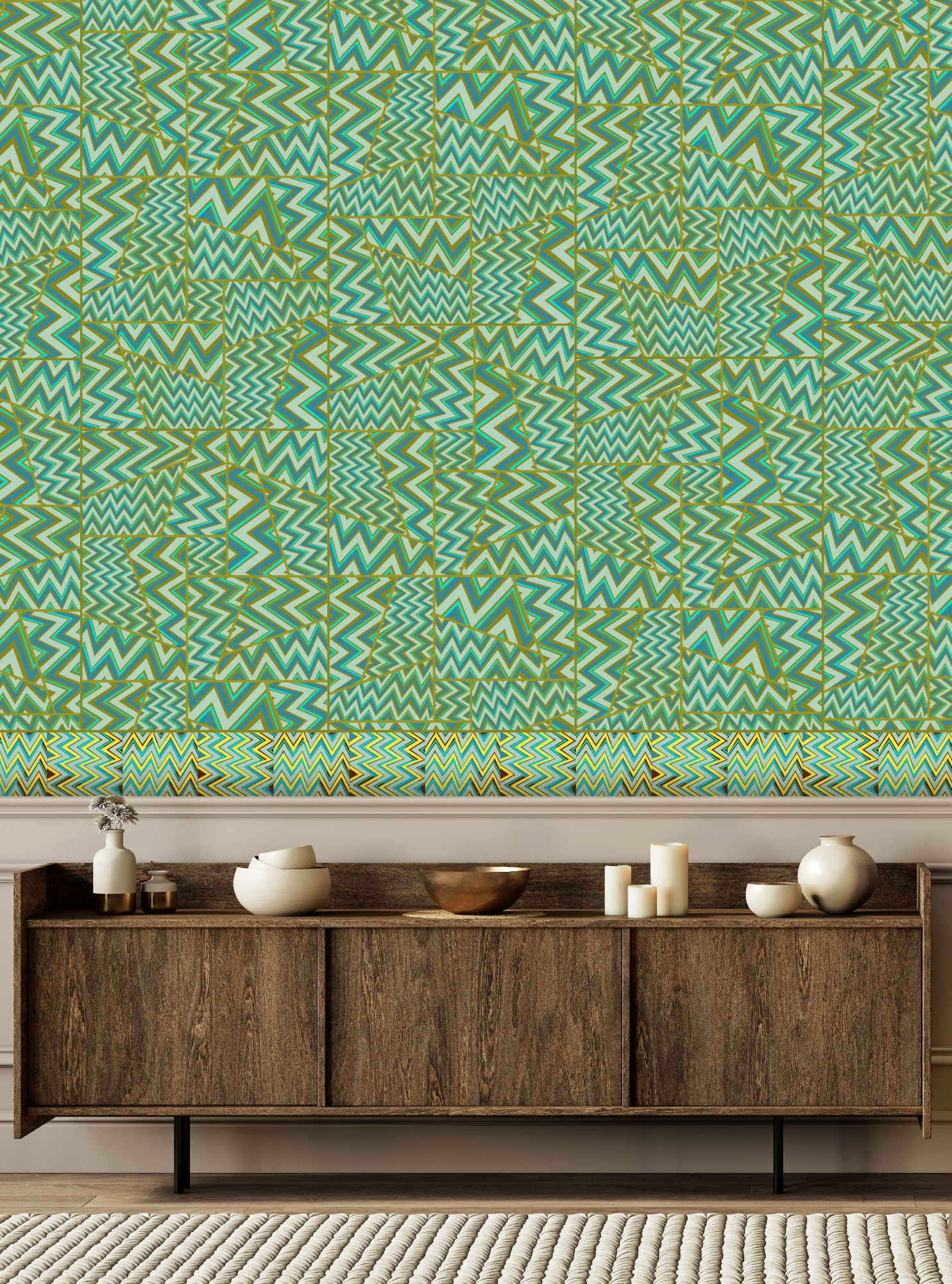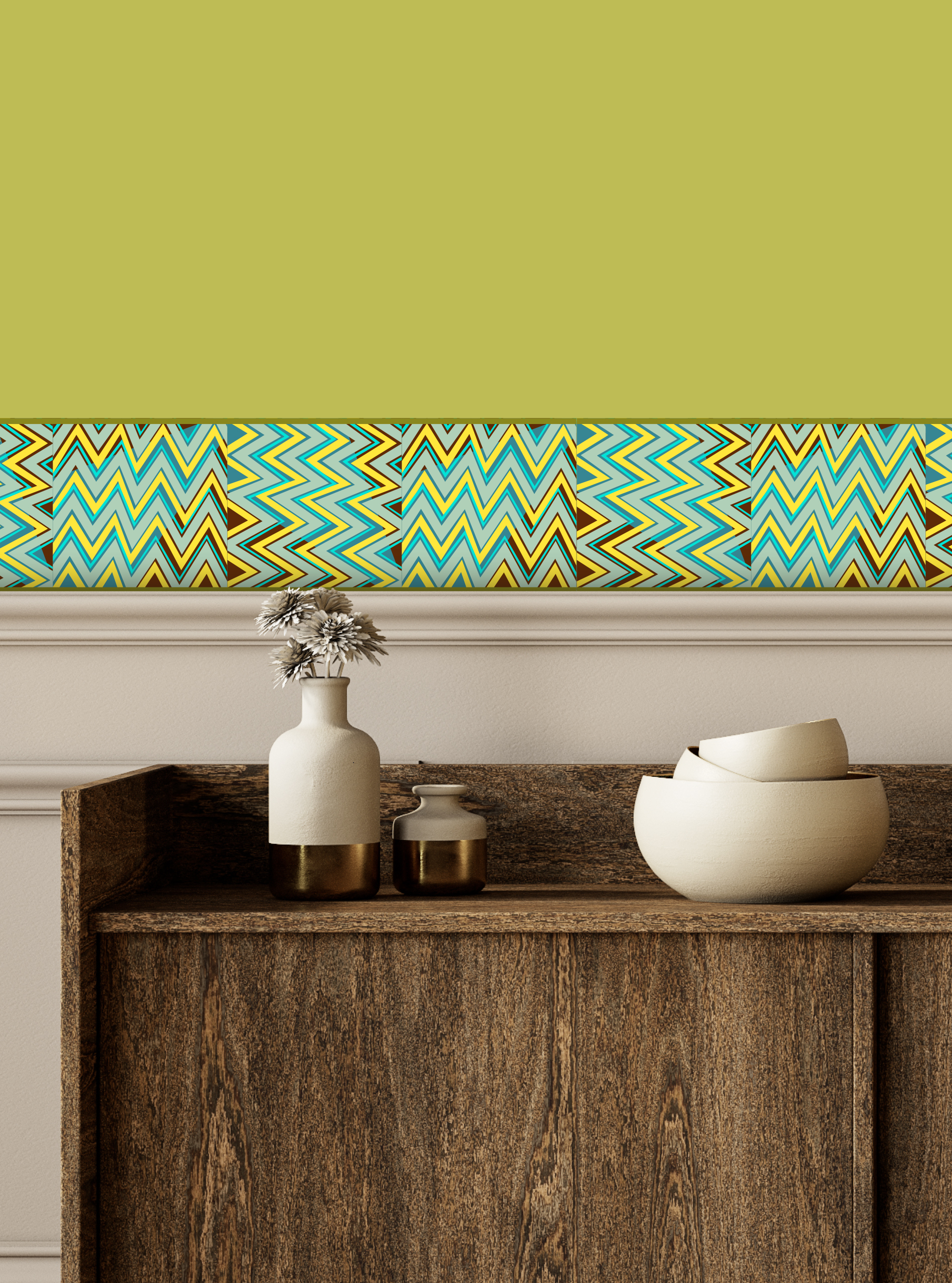 This wallpaper border features bold, Aztec-inspired zigzag patterns in vibrant tones of teal, green, yellow, turquoise, brown, and gold.